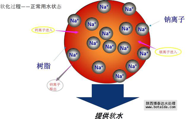 當(dāng)水中的鈣鎂離子含量高時(shí),離子交換樹脂可以釋放出鈉離子,功能基團(tuán)與鈣鎂離子結(jié)合,這樣水中的鈣鎂離子含量降低,水的硬度下降。硬水就變?yōu)檐浰@是軟化水設(shè)備的工作過程。