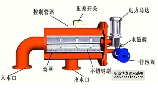 待處理的水由入水口進(jìn)入機(jī)體,水中的雜質(zhì)沉積在不銹鋼濾網(wǎng)上,由此產(chǎn)生壓差。通過(guò)壓差開關(guān)監(jiān)測(cè)進(jìn)出水口壓差變化,當(dāng)壓差達(dá)到設(shè)定值時(shí),電控器給水力控制閥、驅(qū)動(dòng)電機(jī)信號(hào),引發(fā)下列動(dòng)作:電動(dòng)機(jī)帶動(dòng)刷子旋轉(zhuǎn),對(duì)濾芯進(jìn)行清洗,同時(shí)控制閥打開進(jìn)行排污,整個(gè)清洗過(guò)程只需持續(xù)數(shù)十秒鐘,當(dāng)清洗結(jié)束時(shí),關(guān)閉控制閥,電機(jī)停止轉(zhuǎn)動(dòng),系統(tǒng)恢復(fù)至其初始狀態(tài),開始進(jìn)入下一個(gè)過(guò)濾工序。